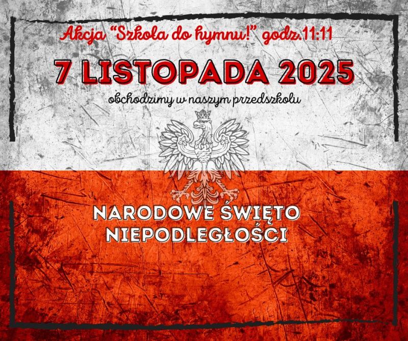 W związku ze zbliżającym się Narodowym Świętem Niepodległości nasze przedszkole włączyło się w ogólnopolską akcję pt. „Szkoła do hymnu”, zorganizowaną przez Ministerstwo Edukacji Narodowej. W ramach tej akcji dnia 7 listopada punktualnie o godzinie 11:11 cała społeczność przedszkola uroczyście zaśpiewała Hymn Polski. Dźwięki "Mazurka Dąbrowskiego"- odśpiewane przez nasze Przedszkolaki głośno, radośnie i dumnie - rozbrzmiały w sercu każdego:)