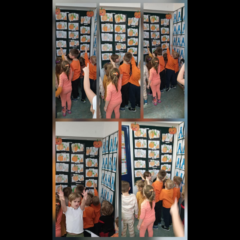 Następnie obchodziliśmy Dzień Dyni. Sala zamieniła się w jesienną, pomarańczową krainę, a dzieci brały udział w zabawach, pracach plastycznych i zajęciach tematycznych związanych z dyniami. Poznały różne odmiany dyń oraz ich zastosowania, a przede wszystkim świetnie się bawiły.