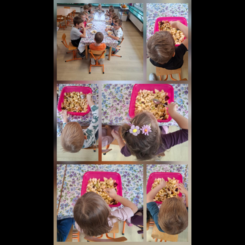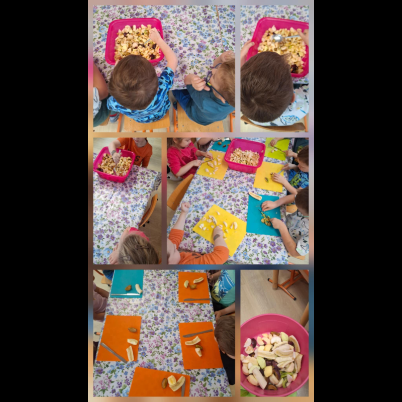 Miesiąc rozpoczęliśmy od wspólnego przygotowywania sałatki owocowej. Dzieci z ogromnym zaangażowaniem kroiły, mieszały i tworzyły własne kompozycje smaków. Była to świetna okazja do rozmów o zdrowym odżywianiu, a także do rozwijania samodzielności i współpracy.