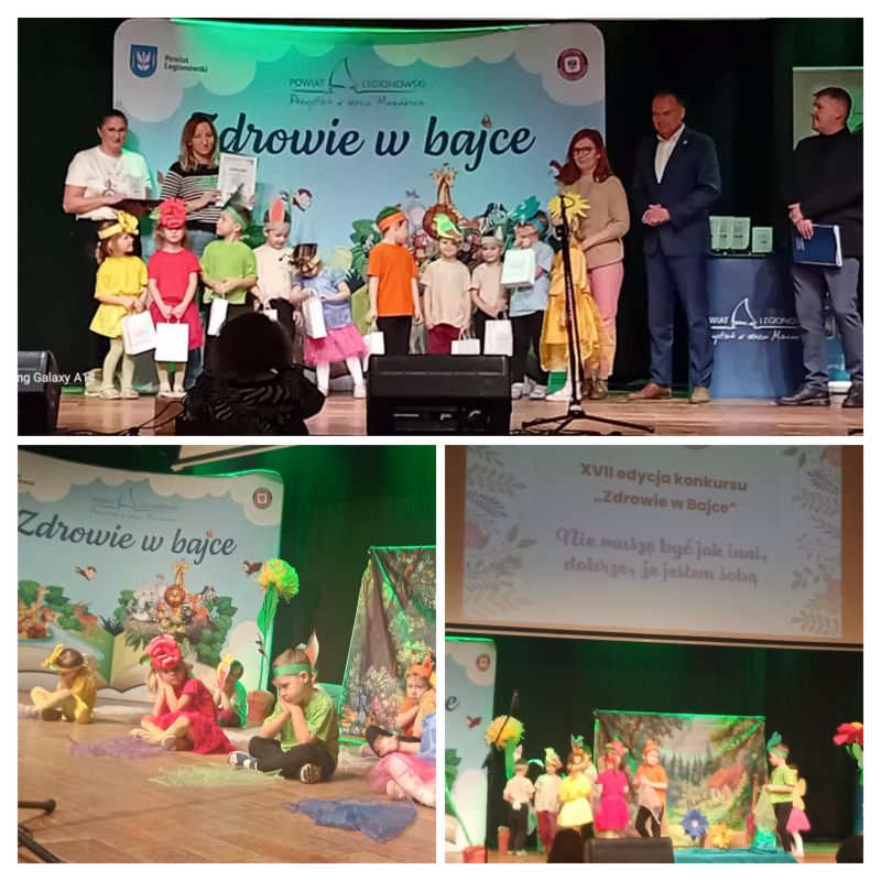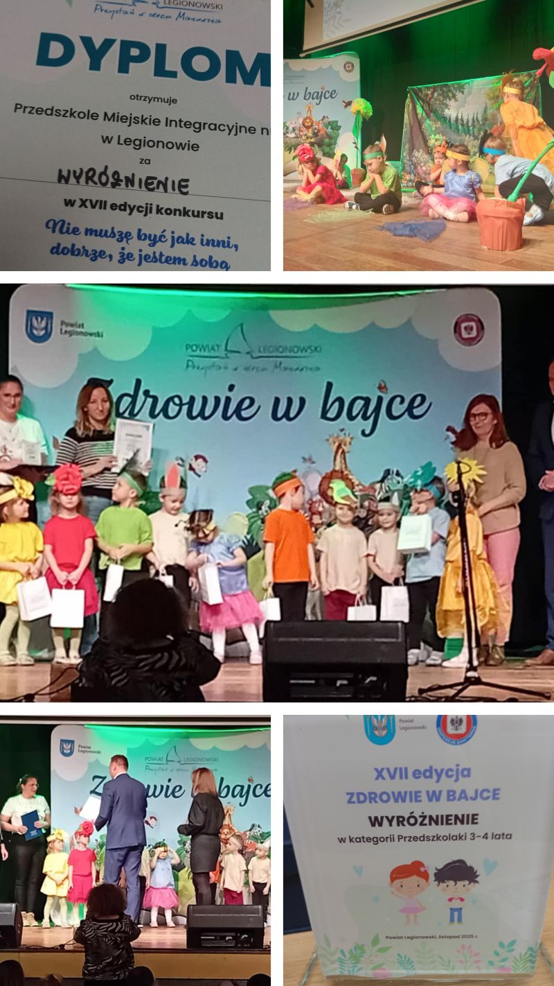 Miło nam poinformować, że nasze niezwykłe czterolatki z Grupy Fioletowej w dniu 24 listopada br. otrzymały wyróżnienie w XVII edycji Konkursu "Zdrowie w bajce", tym razem pod hasłem: "Nie muszę być jak inni, dobrze, że jestem sobą". Organizatorem konkursu był Powiat Legionowski przy wsparciu Powiatowej Stacji Sanitarno - Epidemiologicznej w Legionowie. Nasi mali Aktorzy ze śmiałością i ogromnym zaangażowaniem zaprezentowały historię z pewnej łąki: "Każdy ma w sobie coś pięknego!" Przy dźwiękach nastrojowej muzyki wytańczyły i opowiedziały o tym, że różnorodność jest wartością, a każdy ma prawo być sobą! W wielkim skrócie: fantastyczna ekspresja, cudowne przeżycie, moc emocji! A Artyści? Nasze Dzieciaki są po prostu stworzone do wielkiej sceny:) Pięknie! Inspirująco! Odważnie! Brawo!