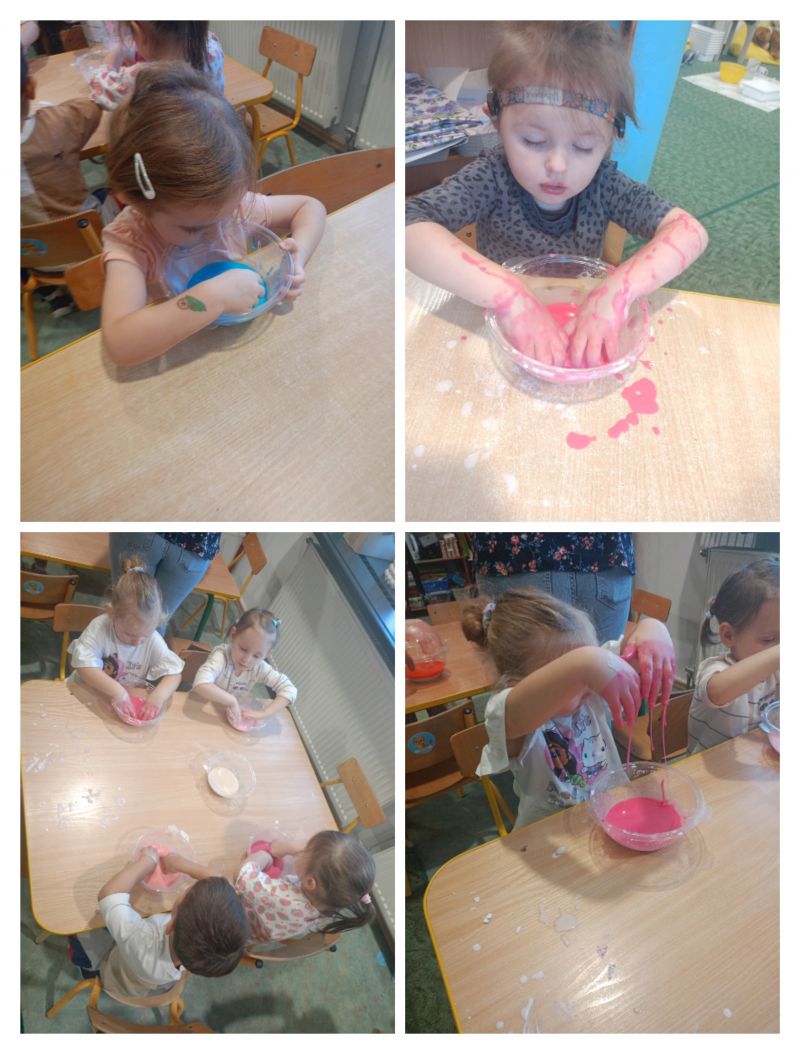 W ramach realizowanej innowacji "W bajkowej krainie zmysłów, ruchu i koloru - kreatywna przygoda z plastyką i ruchem” dzieci brały udział w zajęciach rozwijających motorykę dużą i małą, a także integrację sensoryczną. Przygotowały ciecz nienewtonowską, odkrywając właściwości niezwykłych substancji, a także wykonywały prace plastyczne różnymi technikami, rozwijając kreatywność i zdolności manualne.