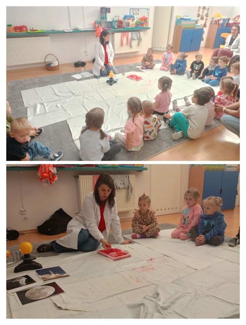 W listopadzie w naszym przedszkolu działo się naprawdę wiele! Dzieci wzięły udział w warsztatach z pierwszej pomocy, podczas których uczyły się, jak reagować w sytuacjach zagrożenia i jak wezwać pomoc. Odwiedził nas także wyjątkowy gość – Kangur, który wprowadził dużo radości i zachęcił przedszkolaki do wspólnych zabaw. Kolejną atrakcją były fascynujące warsztaty Labolo o kosmosie, gdzie mali odkrywcy poznawali planety, gwiazdy i tajemnice Wszechświata, wykonując przy tym ciekawe doświadczenia z "piaskiem księżycowym".