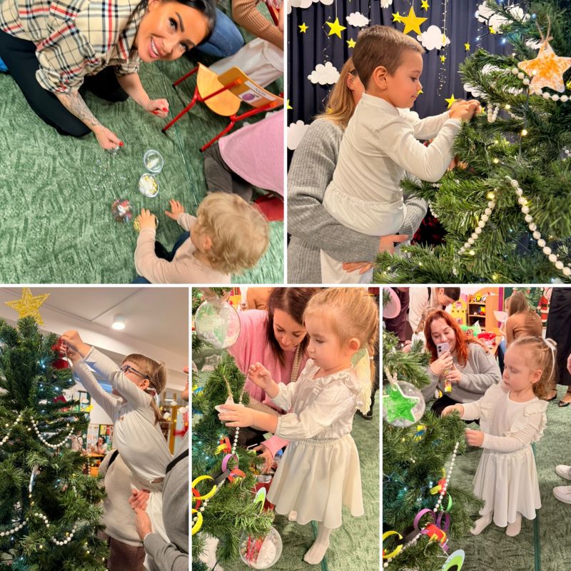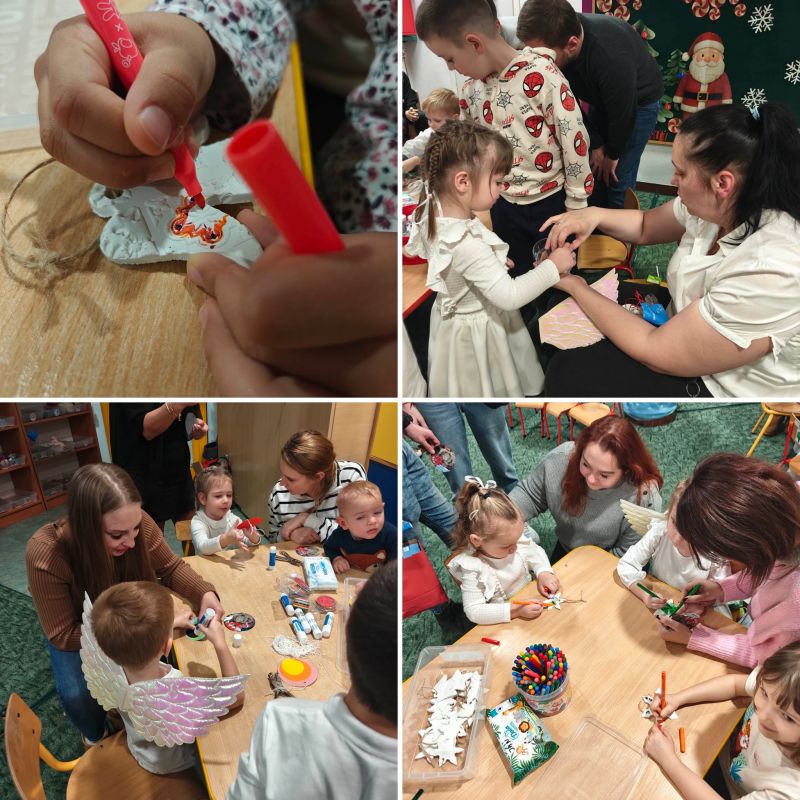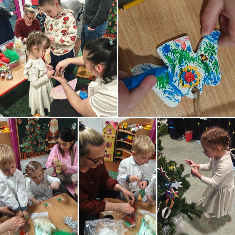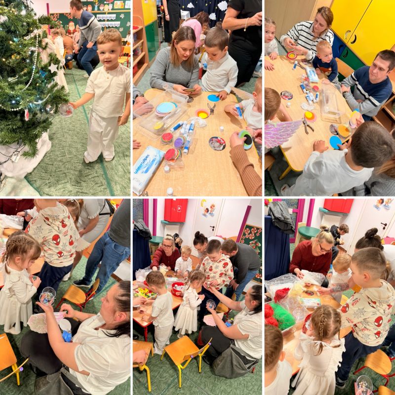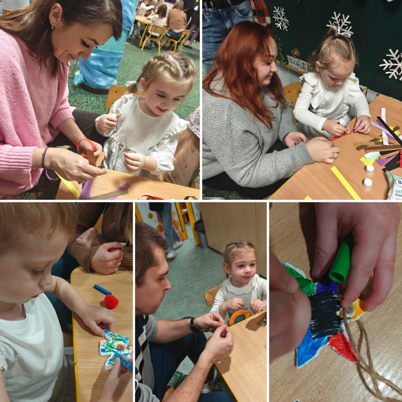 Po części artystycznej świąteczne spotkanie przeniosło się w przestrzeń wspólnego działania. Dzieci wraz z rodzicami wzięli udział w warsztatach plastycznych, podczas których tworzyliśmy własnoręczne ozdoby choinkowe. W atmosferze współpracy, rozmów i radości wspólnie ubraliśmy choinkę w naszej sali, nadając jej niepowtarzalny, rodzinny charakter.
