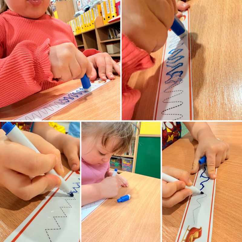 Podczas zajęć grafomotorycznych dzieci ćwiczyły sprawność rąk i palców, rysując po śladzie, kreśląc linie i wykonując proste prace plastyczne. Aktywności wspierały rozwój motoryki małej oraz przygotowywały dzieci do dalszej nauki pisania.