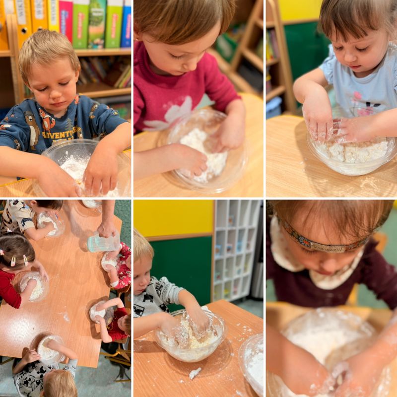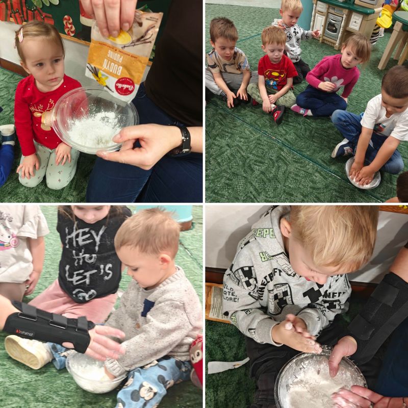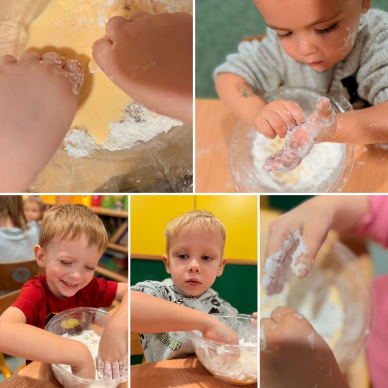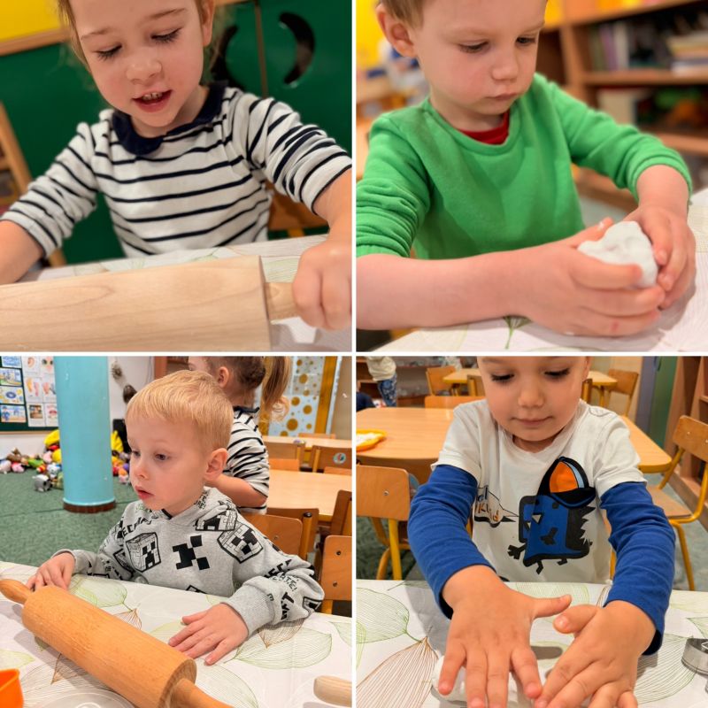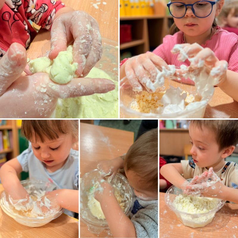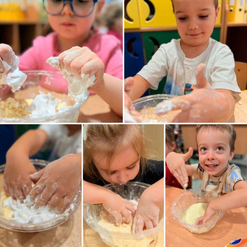 Dzieci uczestniczyły w zajęciach sensoplastycznych, podczas których samodzielnie tworzyły ciastolinę z budyniu. Zabawy masą dostarczały wielu bodźców sensorycznych – dzieci ugniatały, wałkowały i formowały masę, doświadczając różnorodnych faktur oraz przyjemnych doznań zapachowych, pobudzających zmysły.