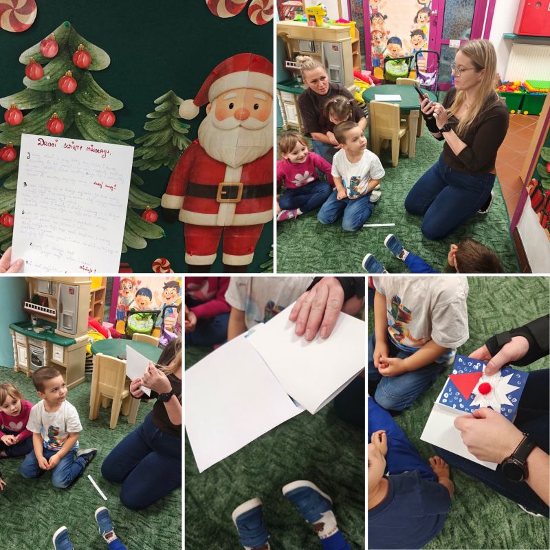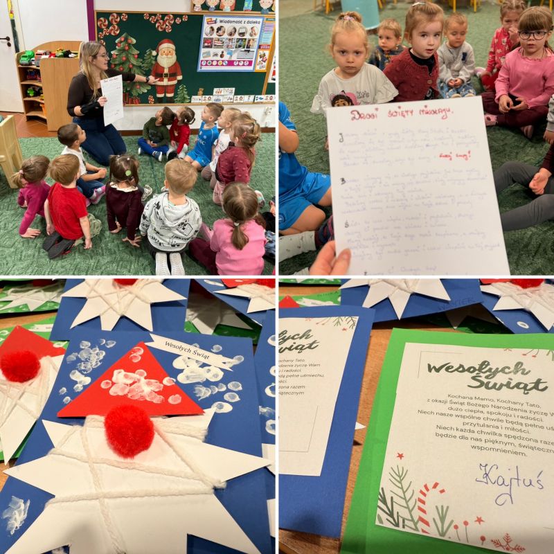 Dzieci wspólnie z nauczycielem tworzyły list do św. Mikołaja. Opowiadały o swoich marzeniach, ćwiczyły wypowiadanie się oraz utrwalały zwyczaje i tradycje związane ze świętami.