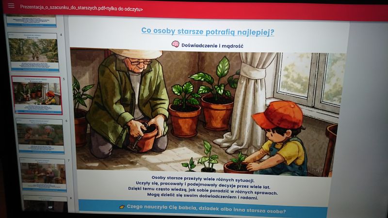 - udział w Ogólnopolskiej Akcji Edukacyjnej: „Dzieci uczą rodziców”: lekcja 2- „O starości i szacunku do osób starszych”
