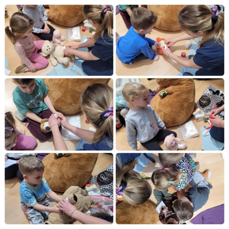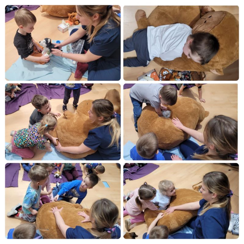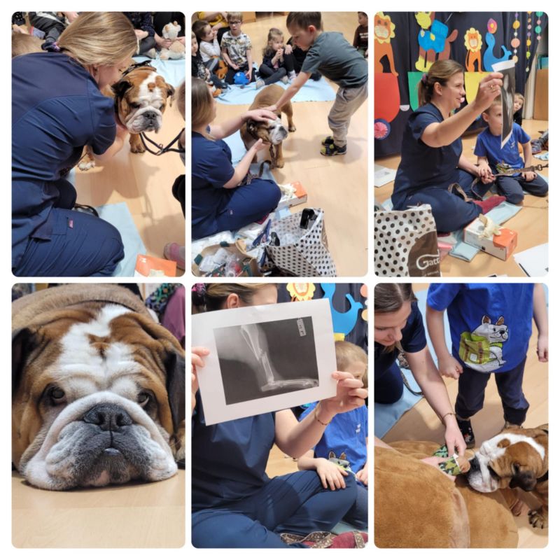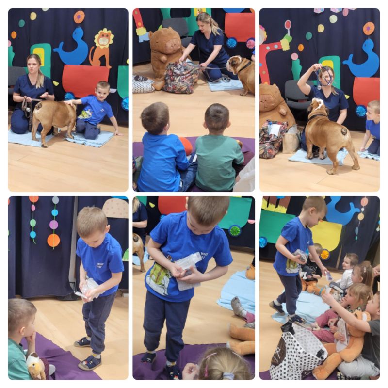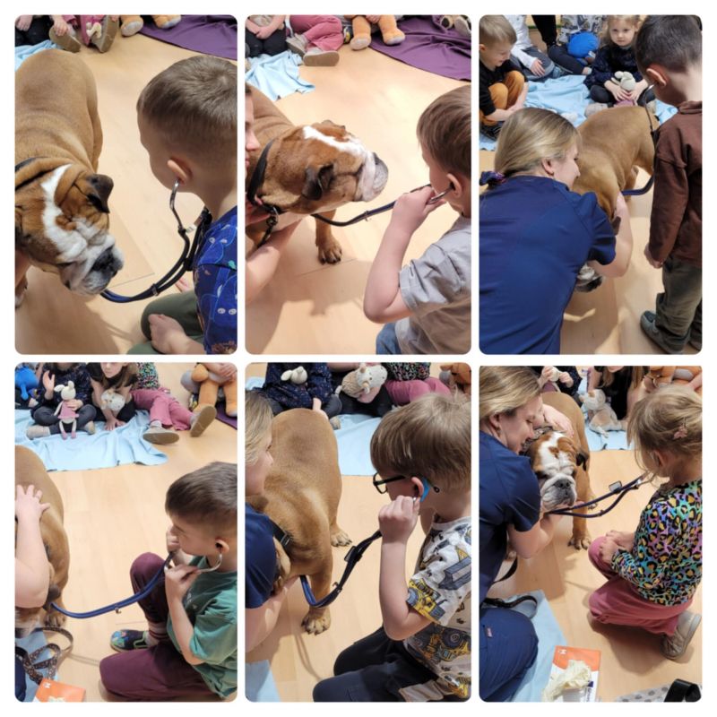 Wyjątkowym wydarzeniem była także wizyta mamy Tymka – pani weterynarz, która odwiedziła nas razem ze swoim psem. Dzieci z zaciekawieniem słuchały opowieści o pracy weterynarza oraz o tym, jak należy opiekować się zwierzętami. Serdecznie dziękujemy za ciekawe i inspirujące zajęcia oraz za spotkanie z przesympatycznym, czworonożnym gościem.