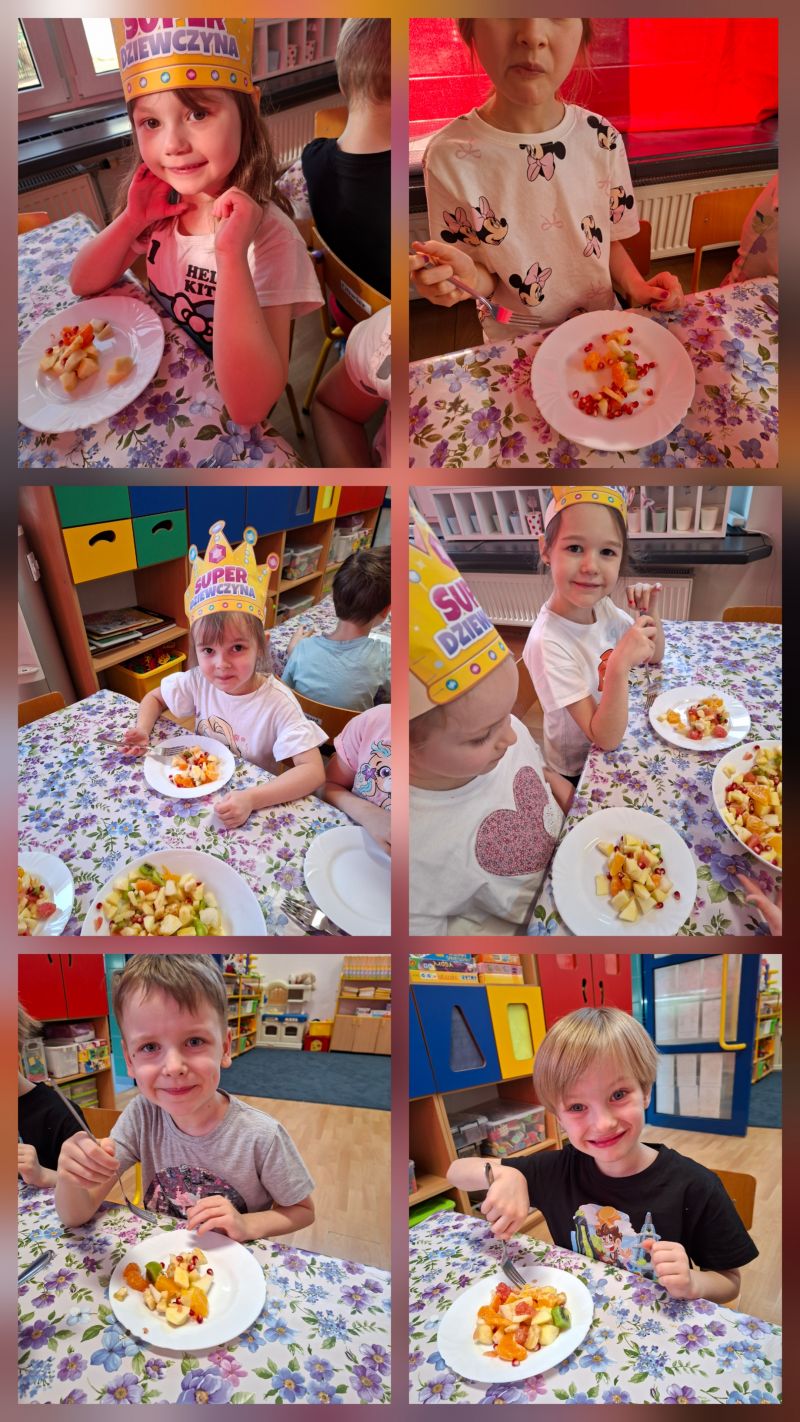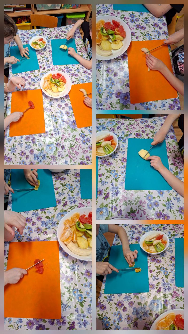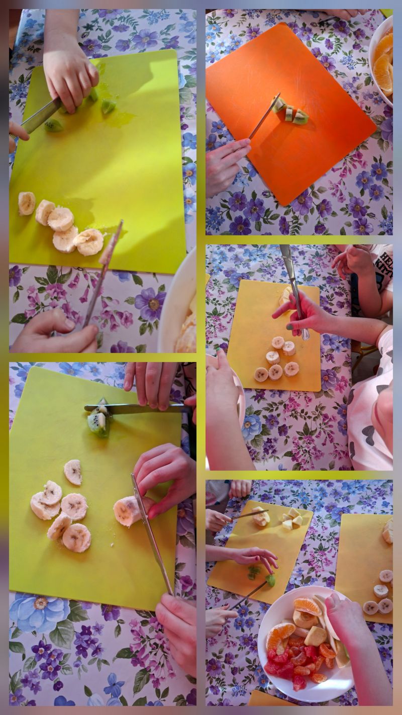 - Gramy Zmysłami „SMAK” – dzieci własnoręcznie kroiły owoce i zrobiły sałatkę owocową, którą ze smakiem zjadły.